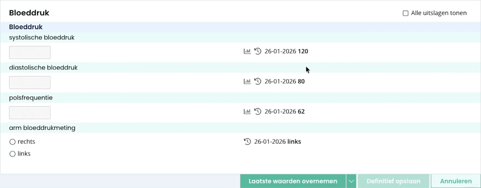 Tijdens het invullen van protocollen in de webbased versie van Bricks Huisarts is het mogelijk om eerder vastgelegde meetwaarden snel te raadplegen. Door op het “klokje” te klikken, krijgt u een overzicht van historisch ingevulde waarden. Deze worden onder elkaar weergegeven, zodat u eenvoudig kunt terugzien wat er eerder is vastgelegd.